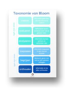 De taxonomie van Bloom is een model dat in 1956 is ontwikkeld door Benjamin Bloom en zijn collega’s om onderwijsdoelen te classificeren. In 2001 werd de taxonomie herzien onder leiding van de Amerikaanse onderwijspsycholoog Lorin Anderson. Deze nieuwe versie omvat zes denkniveaus: onthouden, begrijpen, toepassen, analyseren, evalueren en creëren. De eerste drie niveaus bestaan uit vaardigheden van zgn. ‘lager orde denken’, de bovenste drie denkniveaus vallen onder ‘hoger orde denken’. In de afbeelding hier onder zie je de 6 denkniveaus.