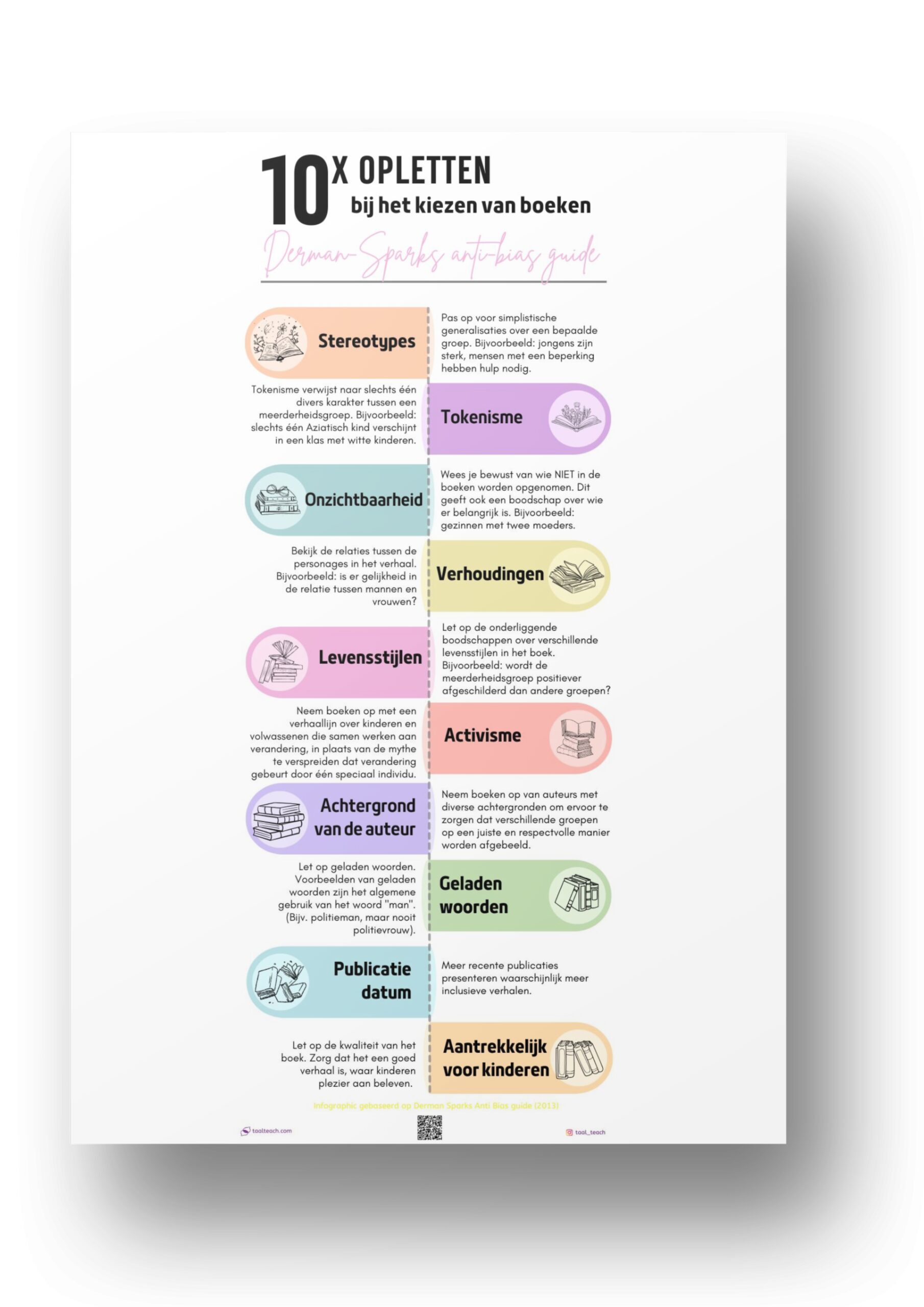 Met de bovenstaande richtlijnen kun je zelf eens kritisch kijken naar je klassenbieb. Moet je boeken met witte jongetjes in de hoofdrol weg gooien? Natuurlijk niet! Maar probeer je bewust te zijn van de samenstelling van de algehele boekenkast: 100% witte jongetjes is niet ideaal. Zo is je klas immers ook niet samengesteld (en de maatschappij ook niet!).