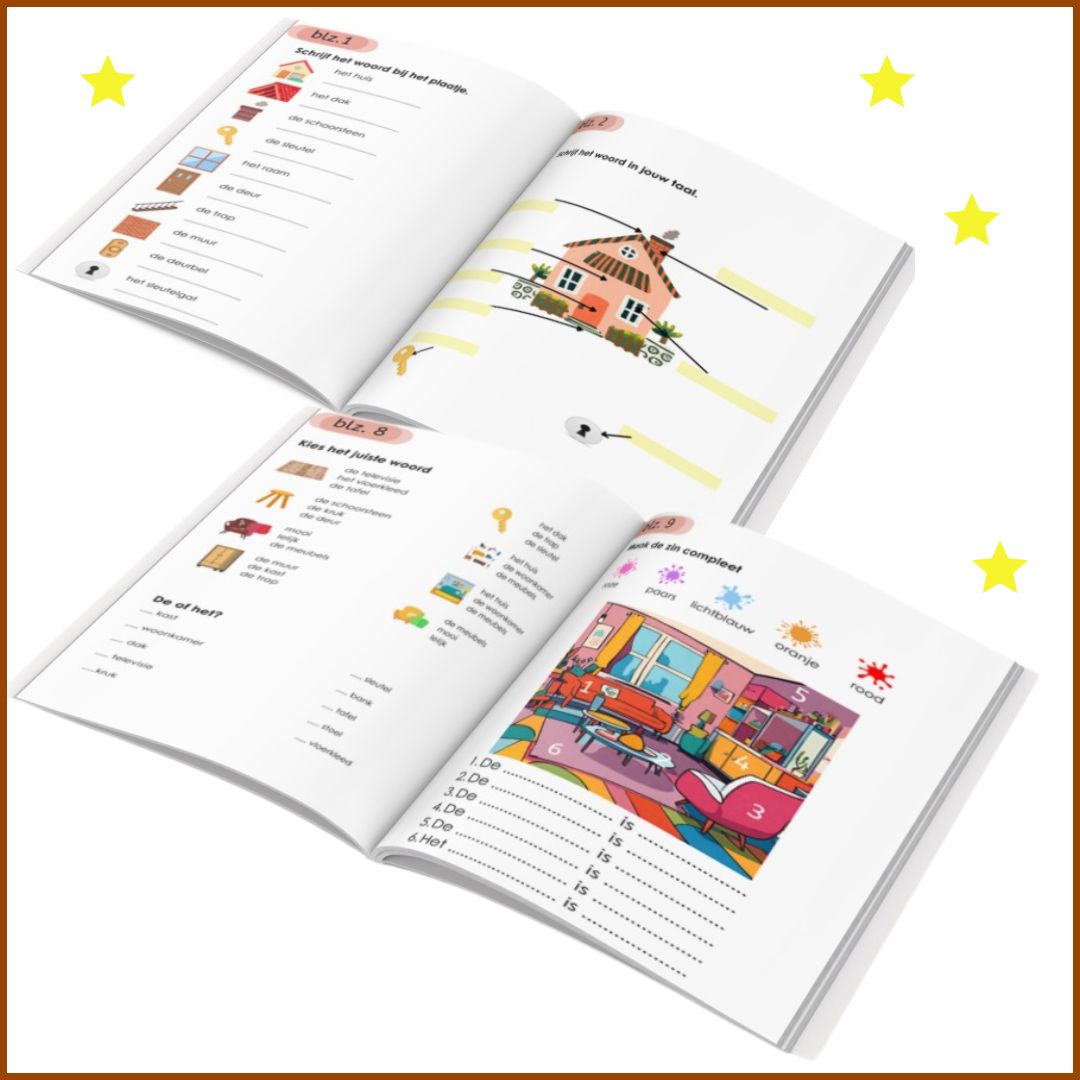- Werkboekje. 38 pagina’s met oefeningen als ‘Schrijf het woord bij het plaatje’, ‘Schrijf het woord in jouw taal’ en meer