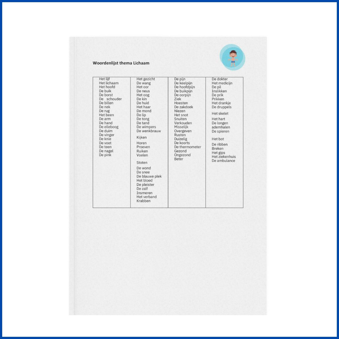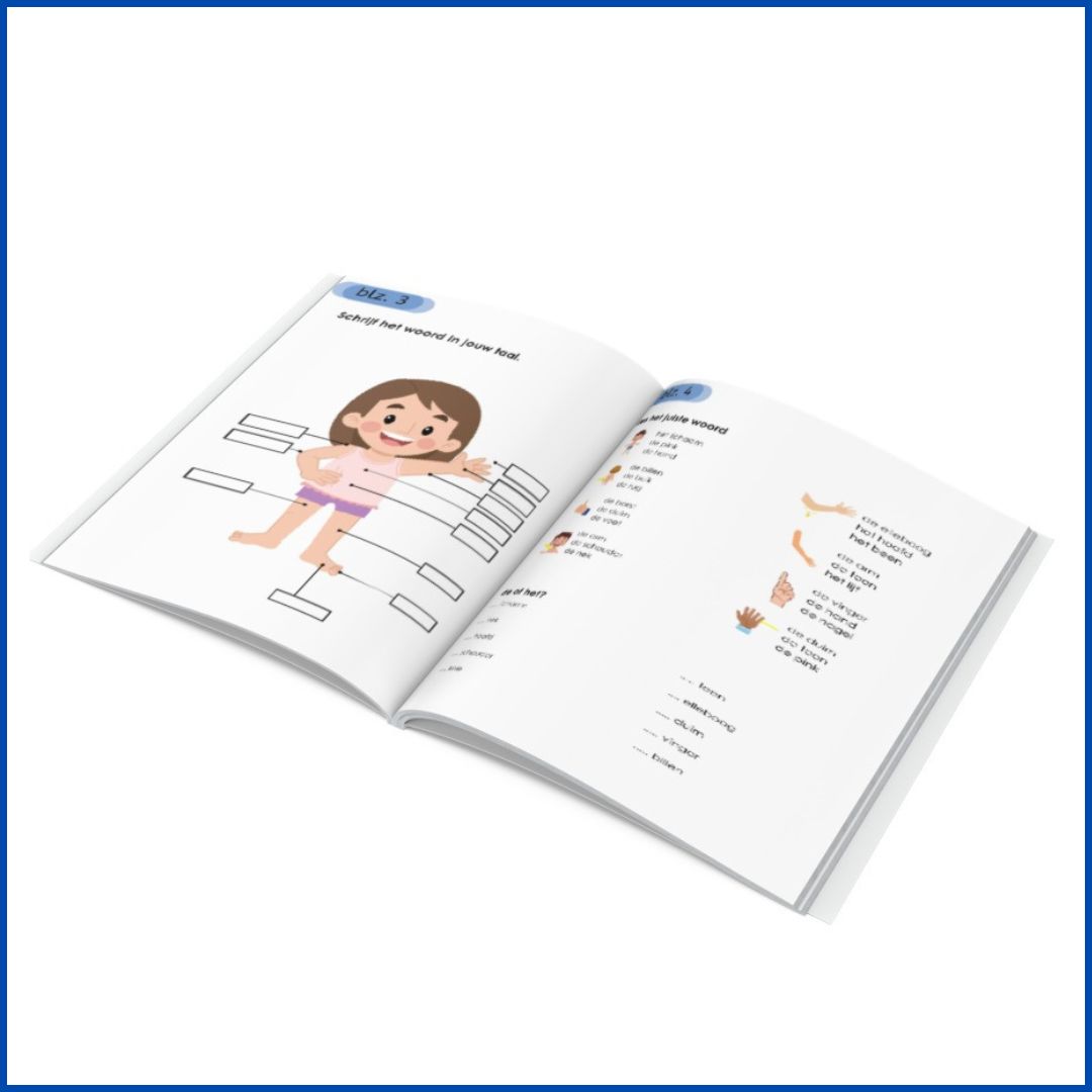 • Werkboekje. 28 pagina’s met oefeningen als ‘Schrijf het woord bij het plaatje’, ‘Schrijf het woord in jouw taal’ en meer